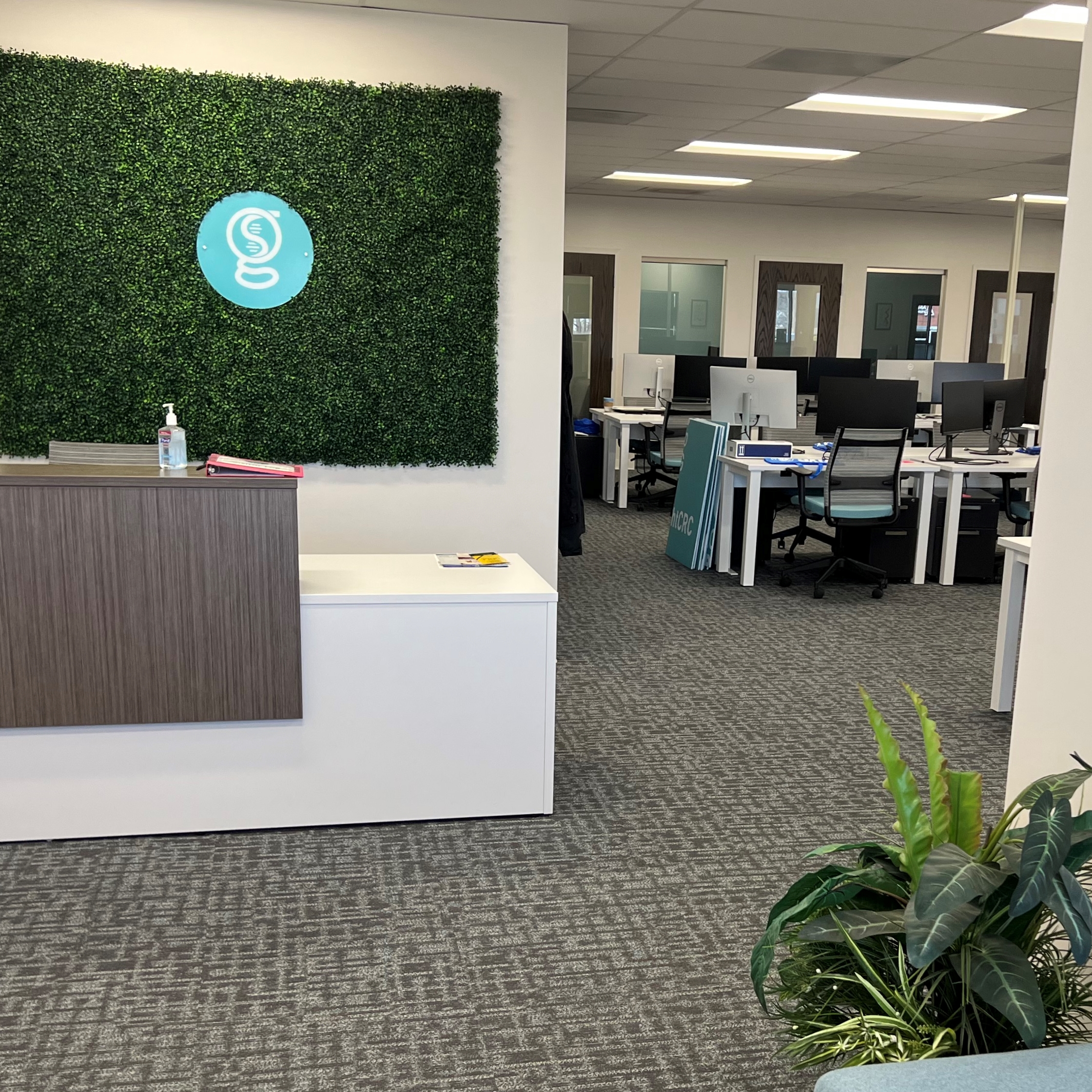 The reception area is designed to perform three primary functions; 1) provide brand name presence, 2) serve as waiting area for guests, and 3) serve as the security & door access control point for employees and guests.