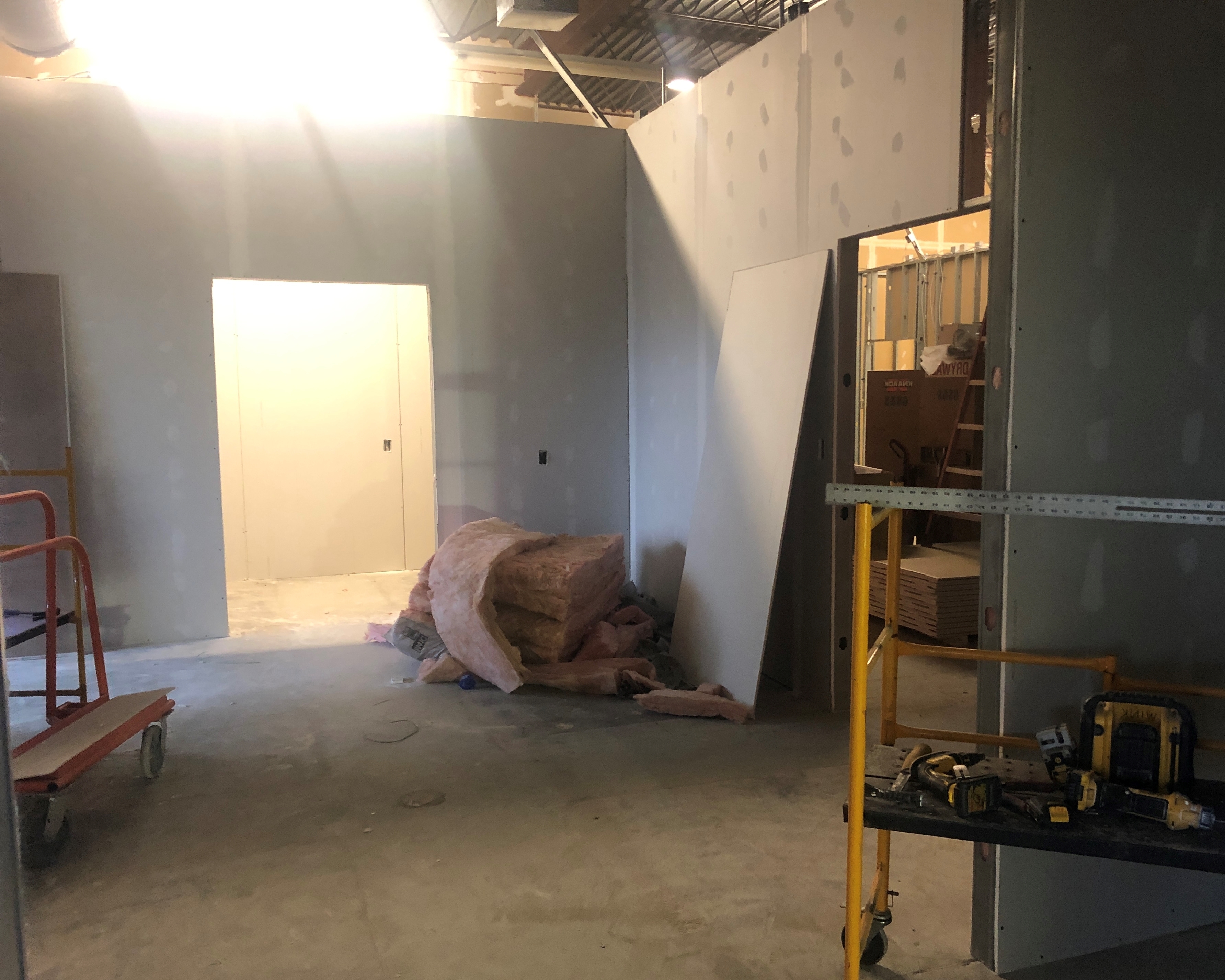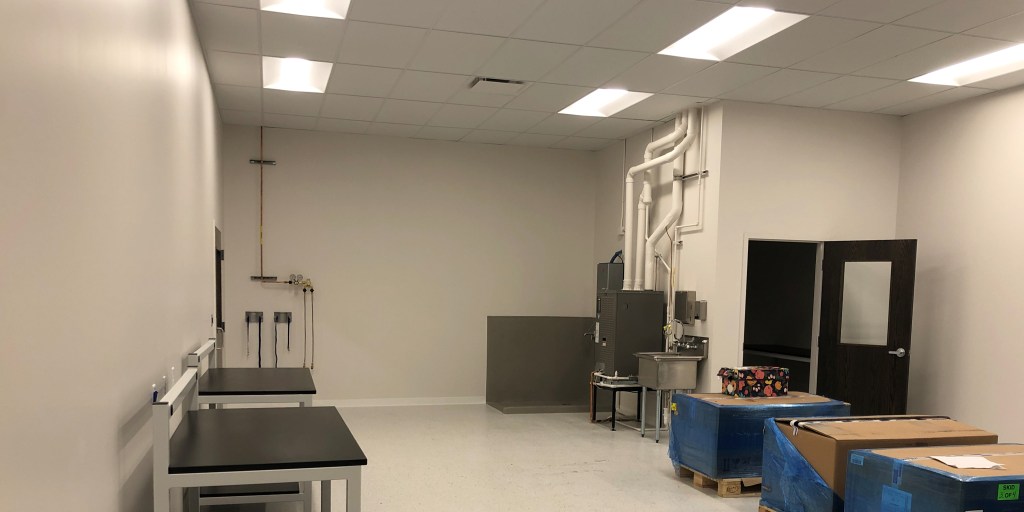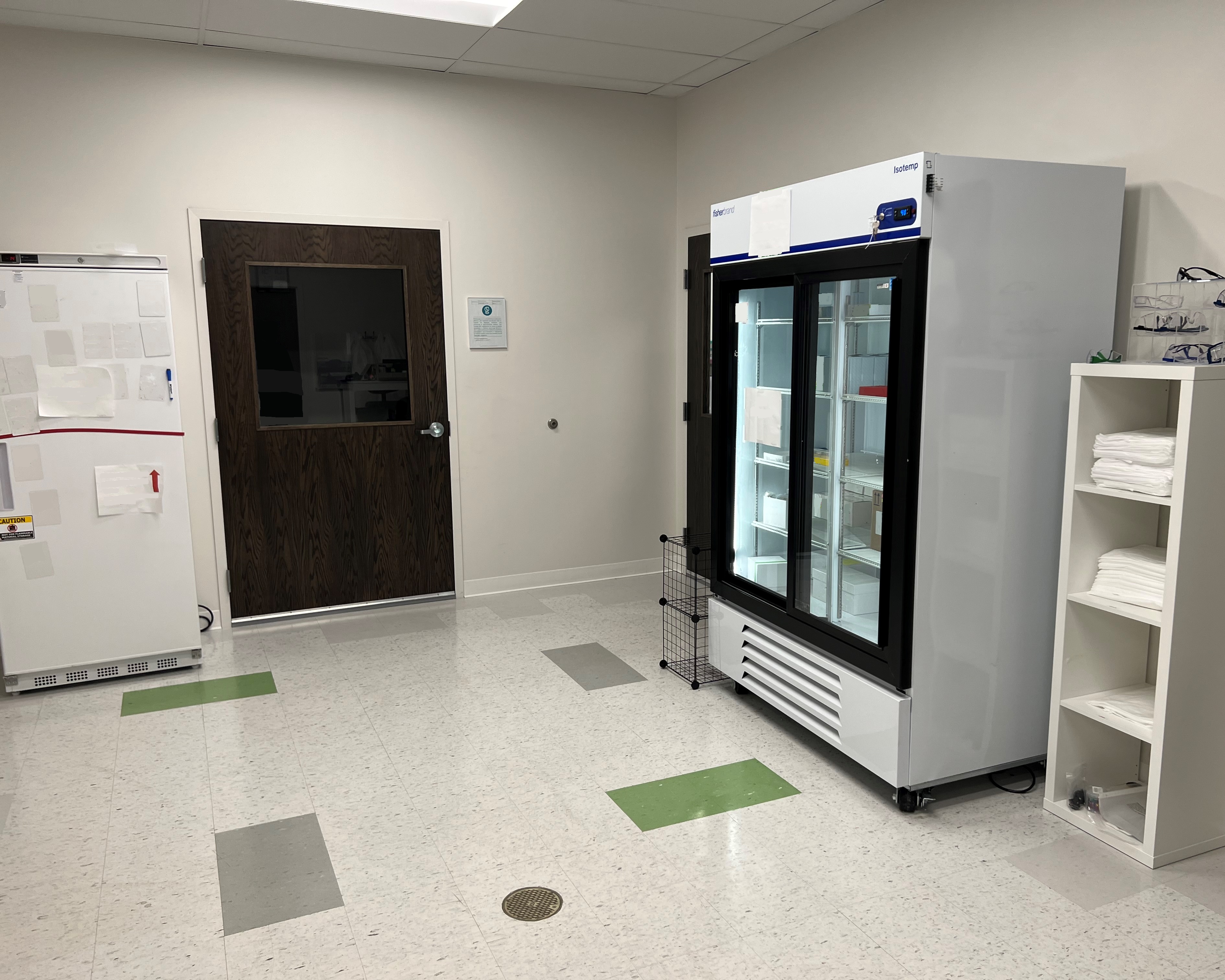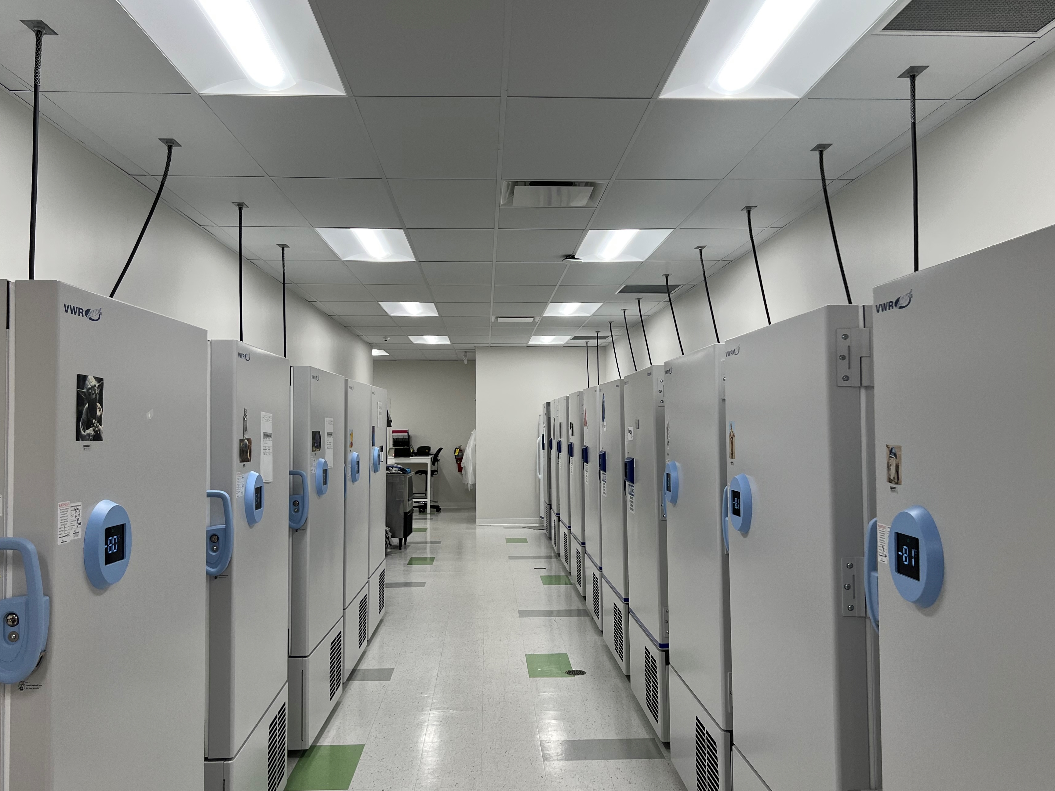 During facility design review, a deliberate decision shifted the restrooms further into the office space and allowed this hallway to be large enough to contain freezers on either side of the hallway while maintaining egress routes. Additionally, HVAC and Electrical design support the freezer capacity while maintaining controlled temperature, and humidity even in the event of a prolonged power outage.