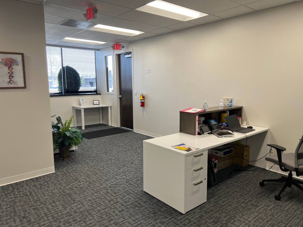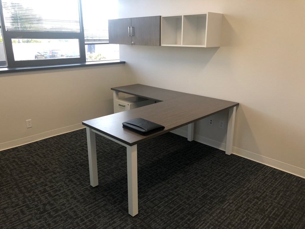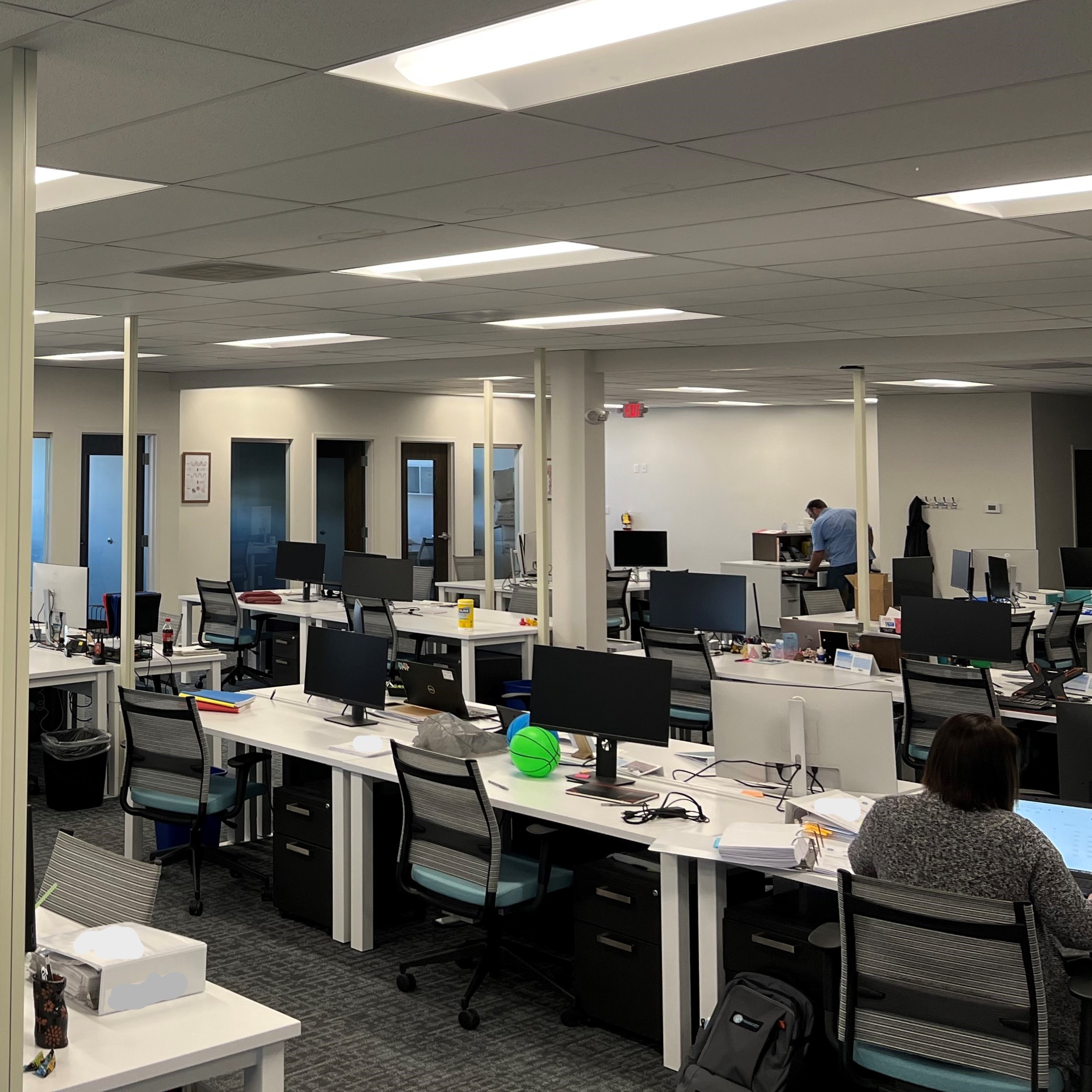 An open office concept with power drops from the ceiling was selected for this space. Office furniture and accessories were designed/depicted in CAD, selected, and installed with assistance from a professional office furniture vendor.