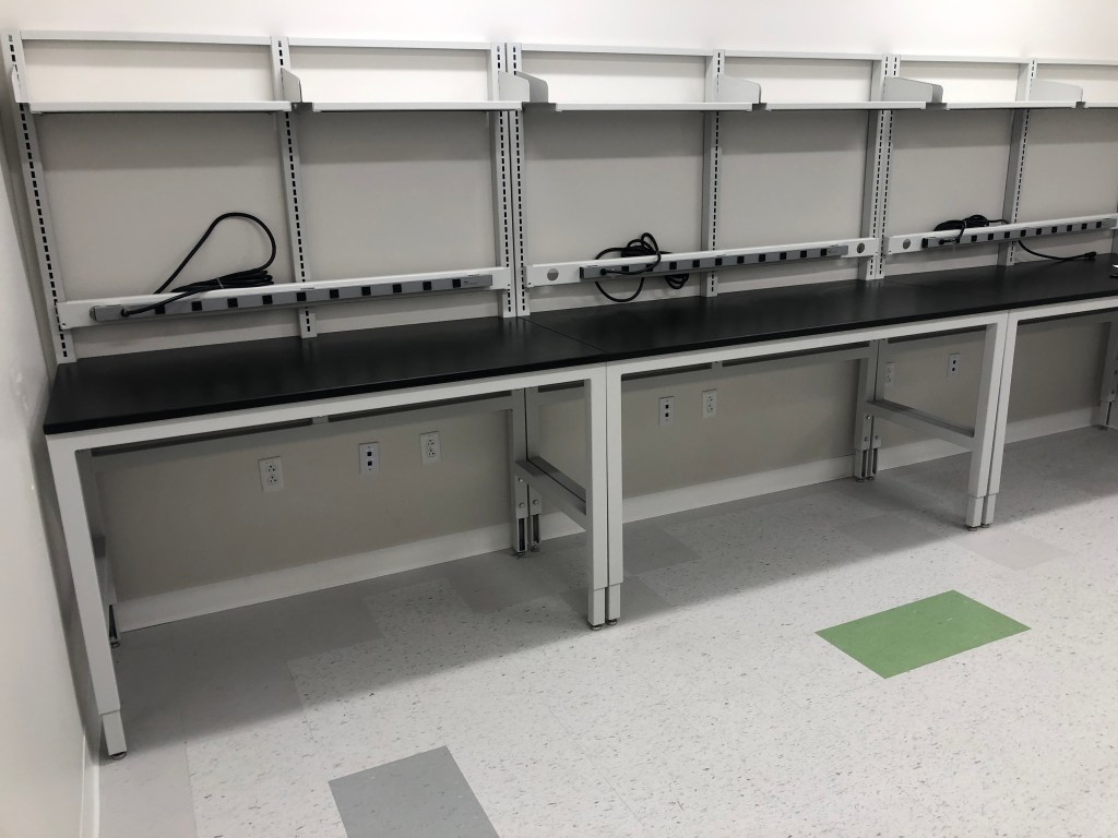 During the design & construction phases of the project, a sample pass-through was selected based on size, mechanical interlock, and requirement to maintain differential pressures between the two labs. The location of the pass-through was dimensionally confirmed with the casework vendor to eliminate interference between the casework and pass-through. Additionally, all labs in the facility are constructed to account for capacity throughput increase. In this photo, the top shelf and additional electrical outlets allows this room to double its current capacity