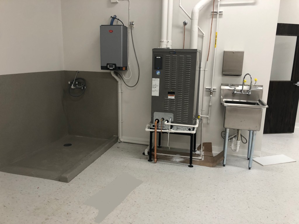 The receiving area is adjacent to the receiving dock and serves as the de-facto main floor utilities room. A whole system laboratory HVAC humidifier (back right-center), the compressed gas tank mounts (back left) for the in-house nitrogen distribution piping, and the custom washdown area (back center) are some of the unique solutions implemented in this facility.